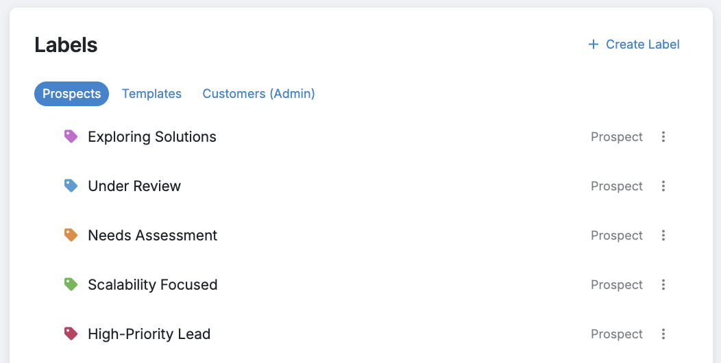 Labels allow you to organize and customize your workspace by tagging prospects, templates, and customers. You can review current labels or create new ones here.