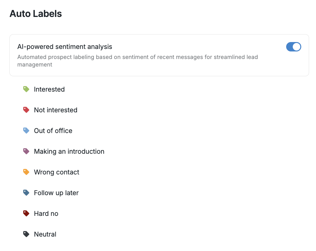 Auto Labels (AI-powered Labels) are automatically assigned to prospects based on their responses. You can activate or deactivate this feature in this section.