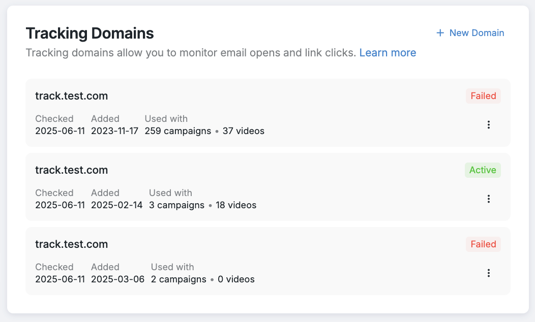 Create and manage your tracking domains in this section. Using tracking domains lets you replace generic links and video URLs in your emails with custom-branded links for better branding.