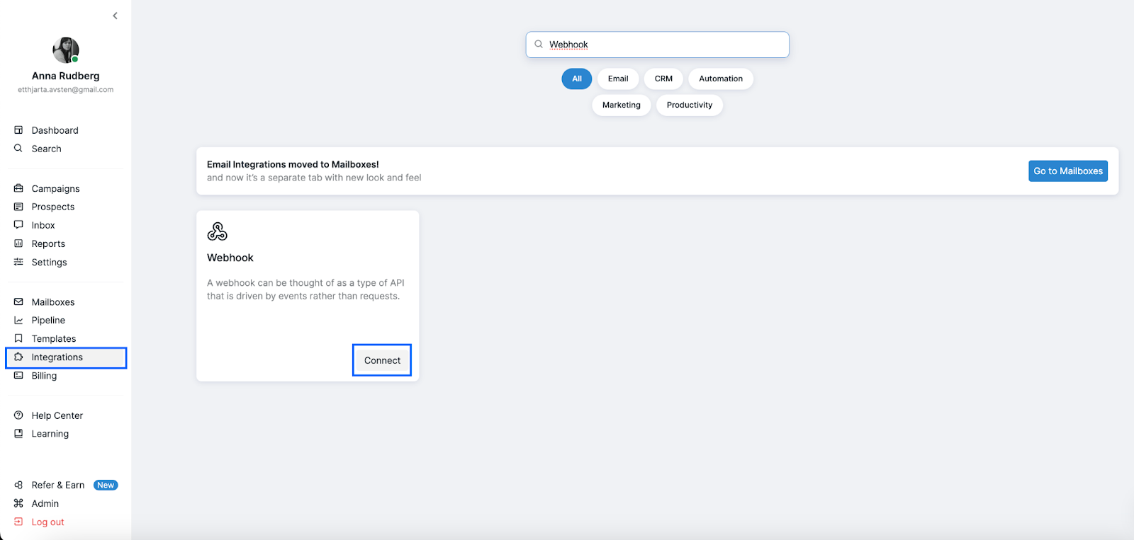 To access your Webhook settings, go to the Integrations tab, find the Webhook integration, and click Connect.