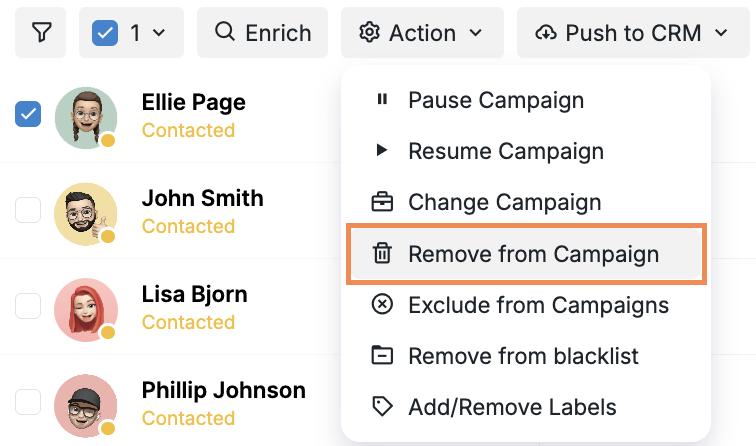 Important: Removing a prospect from a campaign does not delete them from your account. They will still be available in our system as Outside of campaigns.