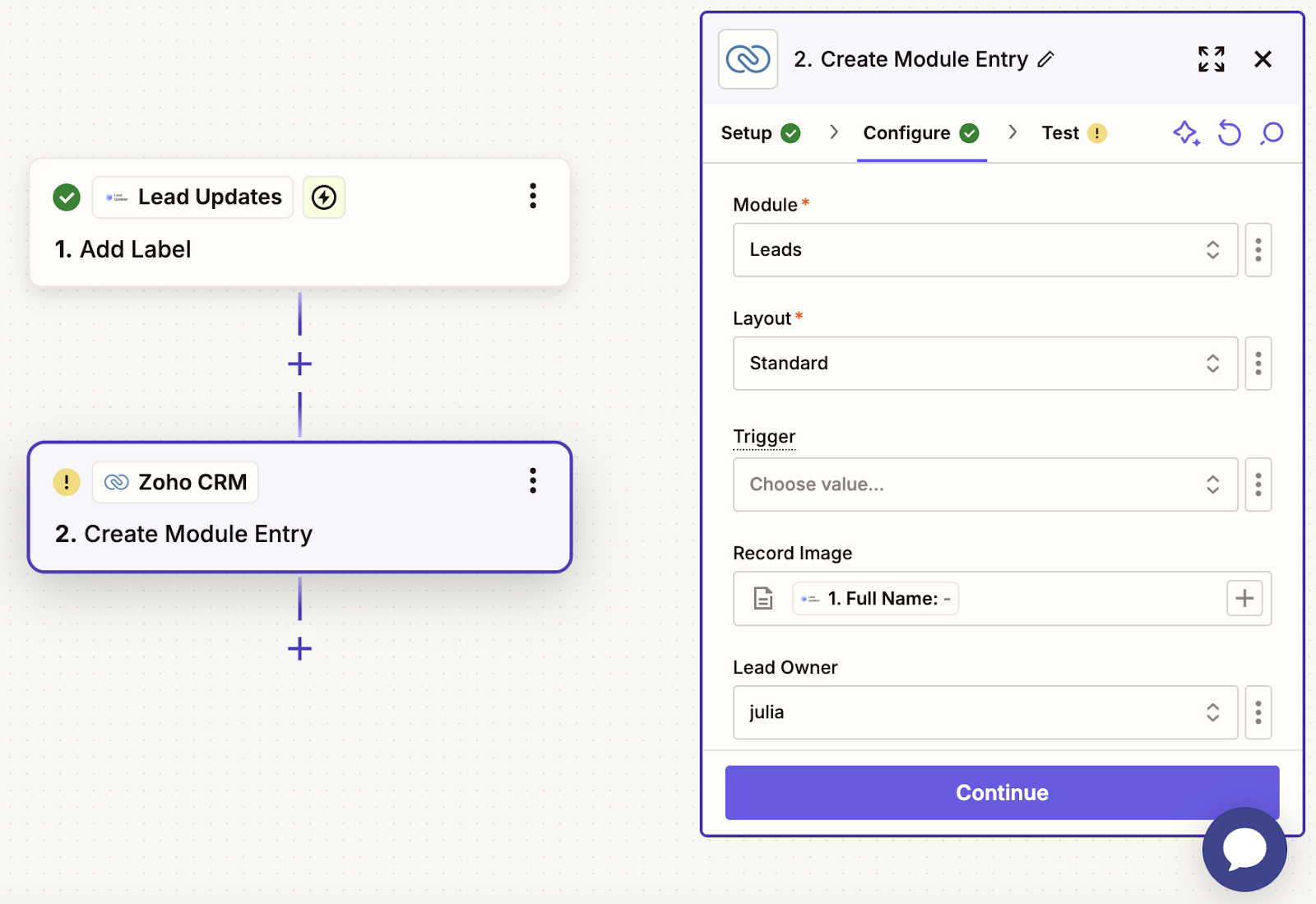 2. Select an action in Zoho CRM — for example, “Create Module Entry.”