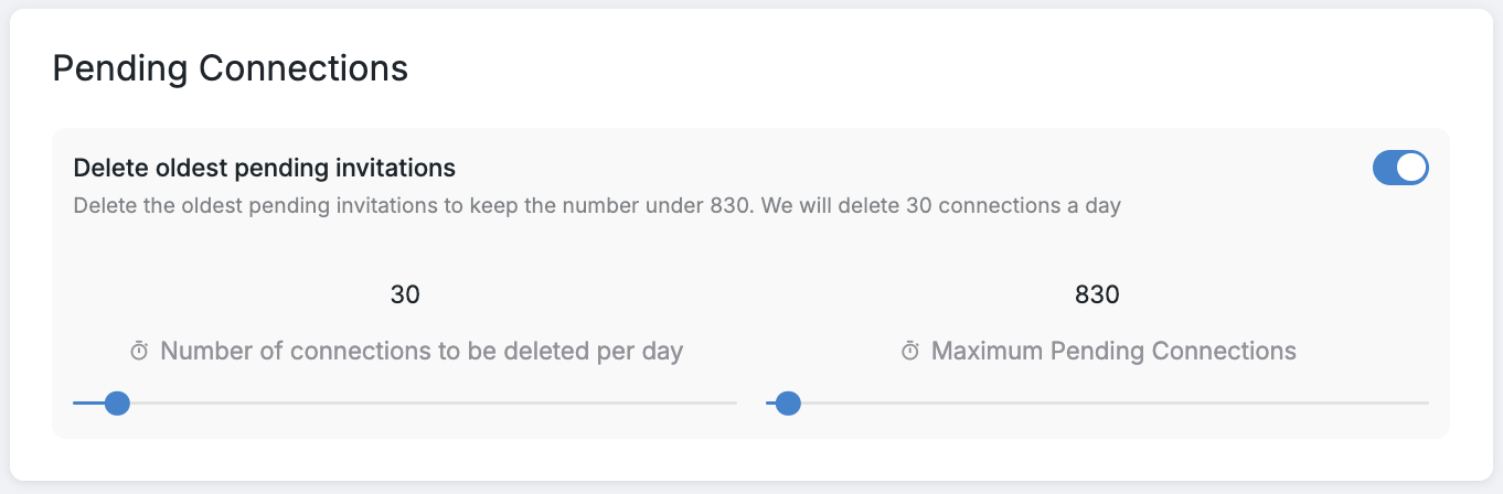 Maximum Pending Connections: The highest number of sent connection requests allowed at any given time. If this limit is exceeded, the system will automatically withdraw the oldest pending requests.