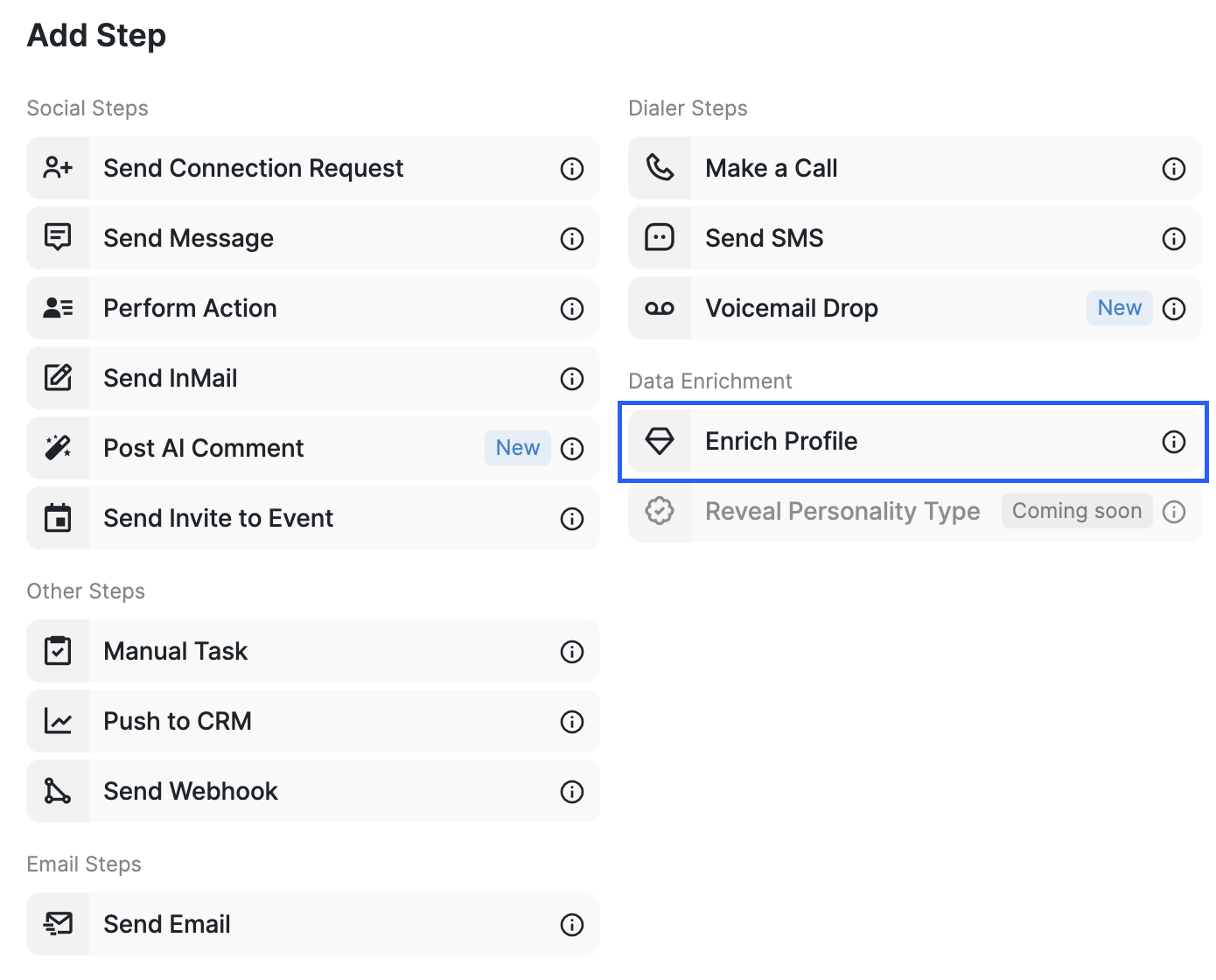 Add Enrich Profile as one of the steps. This will ensure that any prospects added to your campaign are enriched automatically, eliminating the need for manual enrichment.