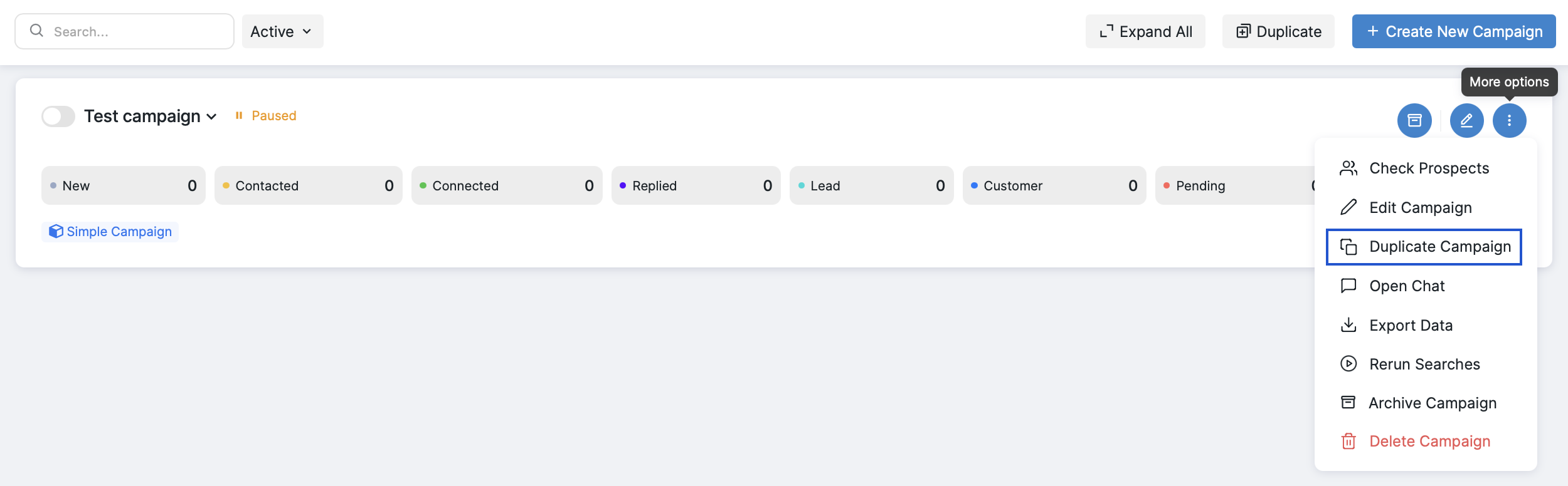 Throughout the duplication process, the campaign’s name, its settings, as well as the campaign steps are copied. However, when you duplicate a campaign to another Social Account, search data, prospects, and conversations won’t carry over — each Social Account has its own unique network, so these elements can’t be copied between them.